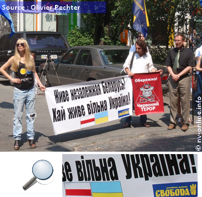 Hutsol no es la única activista de Femen que ha apoyado públicamente al УНП. En esta otra foto, tomada en junio de 2011 y publicada por el periodista francés Olivier Pechter, vemos a más activistas de Femen con una bandera bielorrusa junto a miembros del УНП (con banderas azules) y del grupo ultranacionalista y paramilitar УНА-УНСО (con una bandera roja):